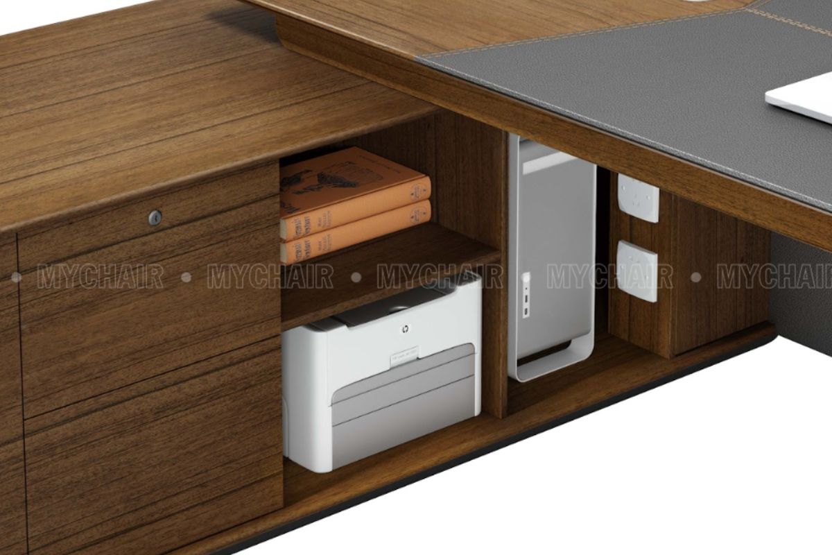 Bàn giám đốc thường được thiết kế để đáp ứng nhu cầu công việc của giám đốc. Loại bàn này thường có kích thước lớn hơn so với các bàn làm việc thông thường và được làm từ các chất liệu chất lượng cao như gỗ tự nhiên hoặc kim loại. Bàn giám đốc thường có các tính năng bổ sung như ngăn kéo tủ khóa vân tay độc đáo, kệ hồ sơ, hộp điện âm bàn. Bàn giám đốc không chỉ là nơi làm việc mà còn là biểu tượng của quyền lực và vai trò quản lý của các lãnh đạo cấp cao.